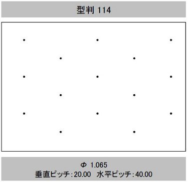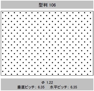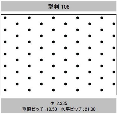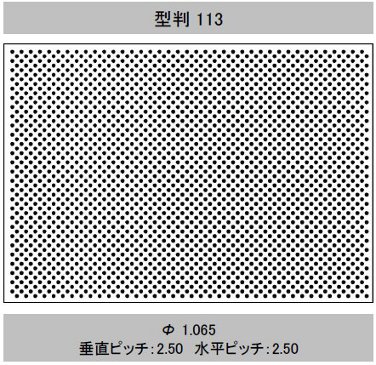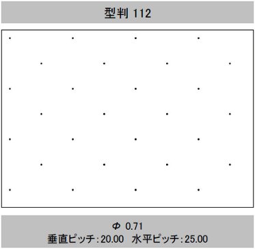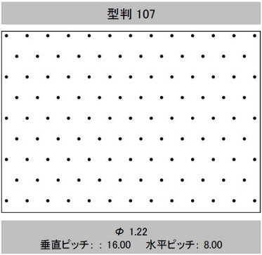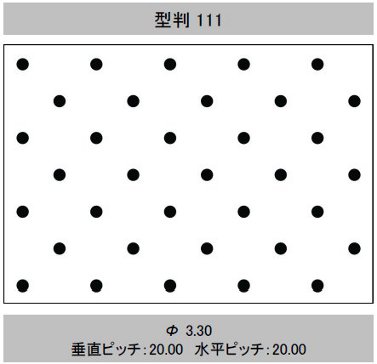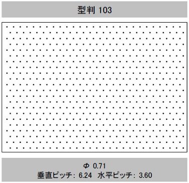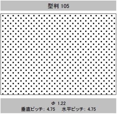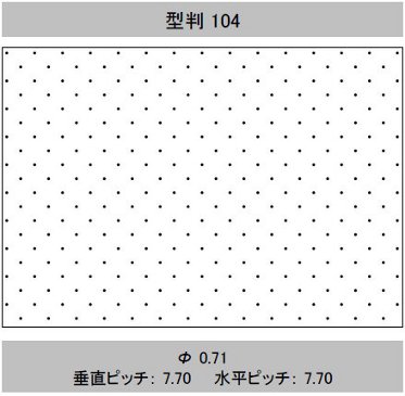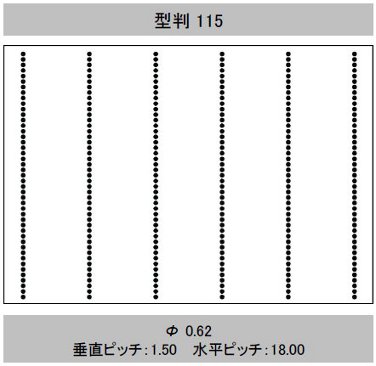 | 型判 | 模様 | 針径(mm) (孔径≒針径×係数 0.6) | 孔間隔(ピッチ) 縦×横(mm) | 有孔数/㎡ | 開孔率(%) | 加工最大巾(mm) | イメージ |
